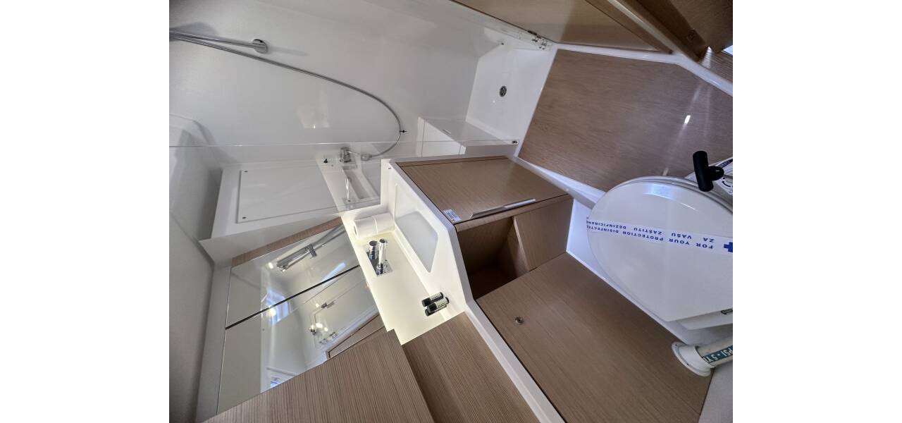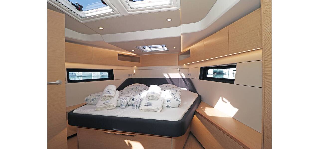 Die Hanse 460 verfügt über drei Kabinen: eine große Eignerkapitänskabine mit eigener Toilette, zwei Achterkabinen mit je einer Toilette und eine Stauraumkabine – optimal für die Aufbewahrung der originalen Deck- und Cockpitpolster.